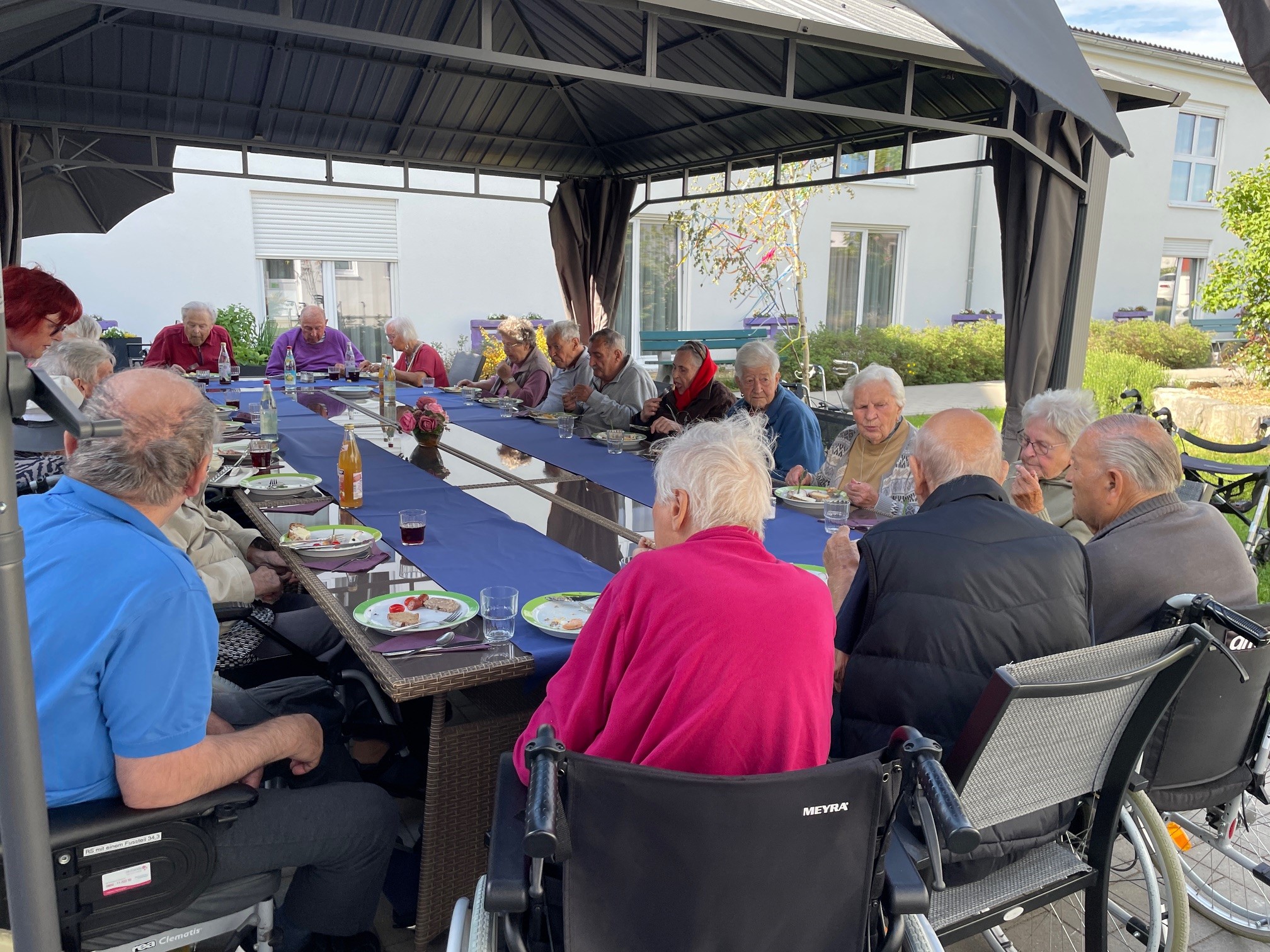 Unsere Mitarbeiter aus der Betreuung haben die Tafel unter unserem neuen Pavillon gedeckt.